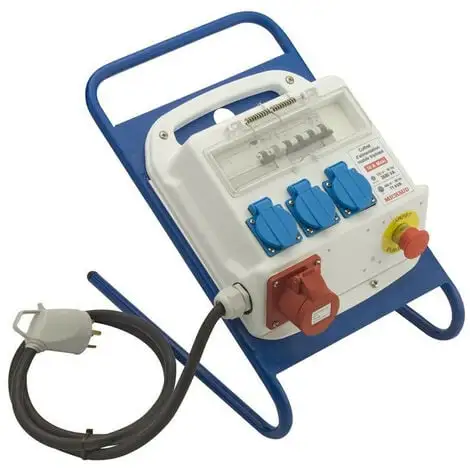 Coffret d’alimentation mobile avec pied équipé de 3 prises 16A brochage domestique 2P+T et 1 prise 16A brochage industriel 3P+T, 1 interrupteur différentiel tétrapolaire 30 mA, 1 disjoncteur tétrapolaire 16A et 1 disjoncteur bipolaire 16A