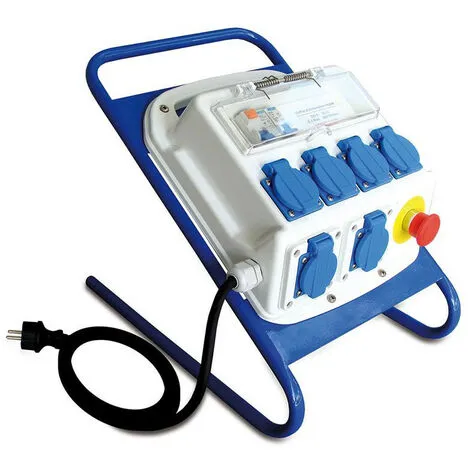 Coffret d’alimentation mobile avec pied équipé de 6 prises 16A brochage domestique 2P+T, 1 interrupteur différentiel bipolaire 30 mA et 1 disjoncteur bipolaire 16A