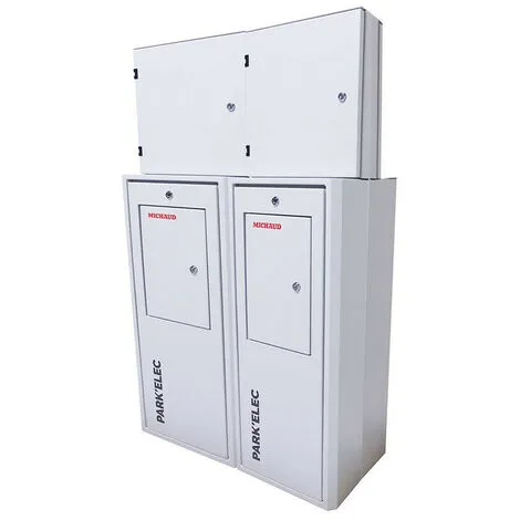 Ensemble de 4 totems destinés à recevoir CCPI type CIBE et panneau de comptage (non fournis). Intègre coffrets de protection des bornes de recharge. Avec supports compatibles toutes Wallbox 7,4 kVA.